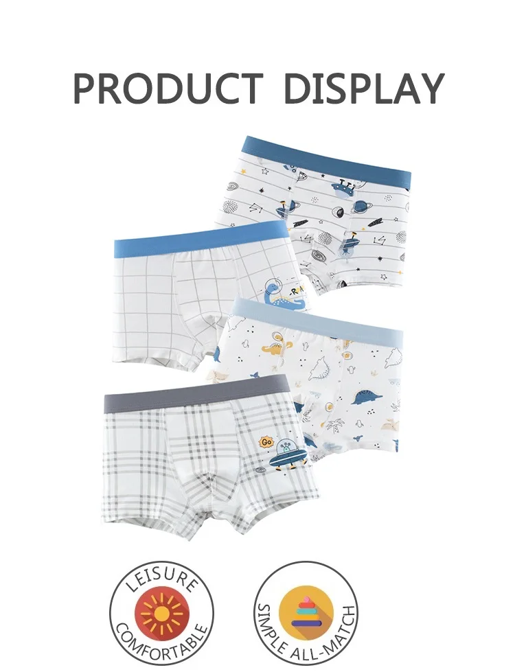 Upgrade your child's wardrobe with this vibrant 4-pack of boys' cartoon boxer shorts, each showcasing fun themes like rockets, whales, and cool geometric shapes. Crafted from ultra-soft, breathable 100% cotton, these boxers offer exceptional comfort for active days or peaceful nights. Designed with a gentle elastic waistband, they're perfect for little explorers aged 4 to 12 years. Available in assorted colors to bring variety and excitement to every day. Treat your boy to underwear that combines playful style with premium quality.
