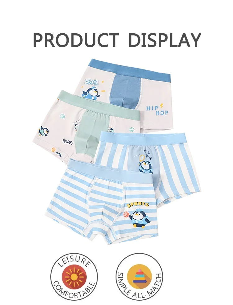 Upgrade your child’s everyday essentials with our boys' cartoon penguin boxer briefs set. This pack includes four adorable pairs, each featuring cheerful penguin graphics in a variety of soft pastel hues. Crafted from an ultra-soft, breathable cotton blend, these briefs provide all-day comfort and support, making them perfect for both active play and lounging. Designed with a tag-free waistband to prevent irritation, these boxer briefs are available in multiple sizes for ages 3-10, so you can find the perfect fit as your child grows. Give your little one a playful start to every day with these durable and easy-care boxer briefs—ideal for gifting too!