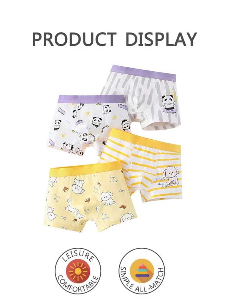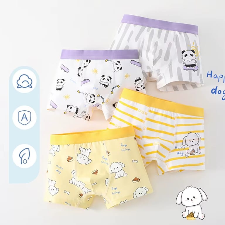 Bring fun and comfort to your child's wardrobe with this delightful set of 4 kids' cartoon boxer briefs. Each pair features adorable panda and dog prints in vibrant, cheerful colors that kids will love. Crafted from ultra-soft, breathable fabric, these boxer briefs ensure all-day comfort for active little ones. Available in sizes S, M, L, and XL, they offer a perfect fit for boys and girls aged 3 to 10. Easy to care for and gentle on sensitive skin, these boxer briefs are the ideal choice for everyday wear. Add a pop of happiness to your child's essentials with this playful and practical set!