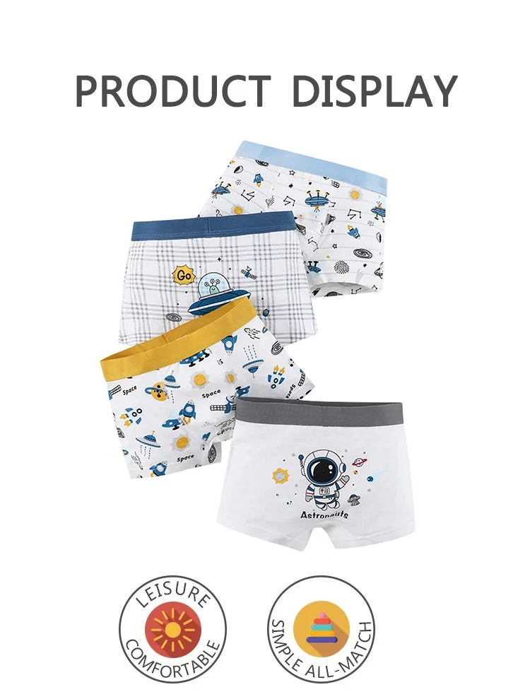 Set of 4 breathable cotton boys' underwear with fun space patterns