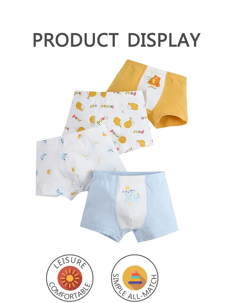 Brighten up your little one's wardrobe with our kids cartoon print underwear set! This pack includes four pairs of boys' briefs, each showcasing cheerful and colorful cartoon designs that kids will love. Crafted from ultra-soft, breathable fabric, these underwear provide all-day comfort and a perfect, gentle fit for growing boys. Available in assorted sizes to suit children ages 2-10, the playful prints and vibrant colors make dressing fun and exciting. Durable and easy to wash, they're ideal for everyday wear and ensuring your child feels confident and happy throughout the day.